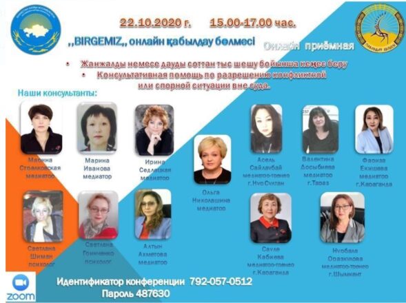 С 14 мая 2020 года на платформе ZOOM, в рамках еженедельной ОНЛАЙН-ПРИЁМНОЙ, медиаторы пяти регионов (Павлодар, Астана, Шымкент, Жамбыл, Караганда) вместе с психологами и специалистами примирительных центров проводят конструктивную работу по оказанию консультативной помощи гражданам всего Казахстана.